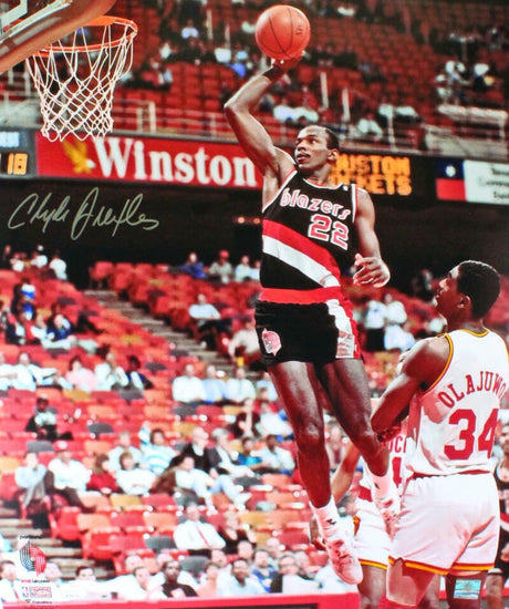 Clyde Drexler Autographed Portland Blazers 16x20 Dunk v. Rockets Photo- JSA W