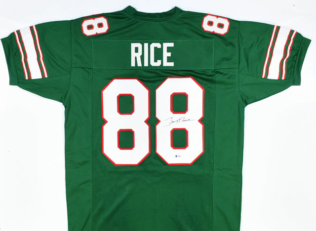 Jerry Rice Autographed Green College Style Jersey - Beckett *Black is backordered and will ship as soon as it is back in stock.