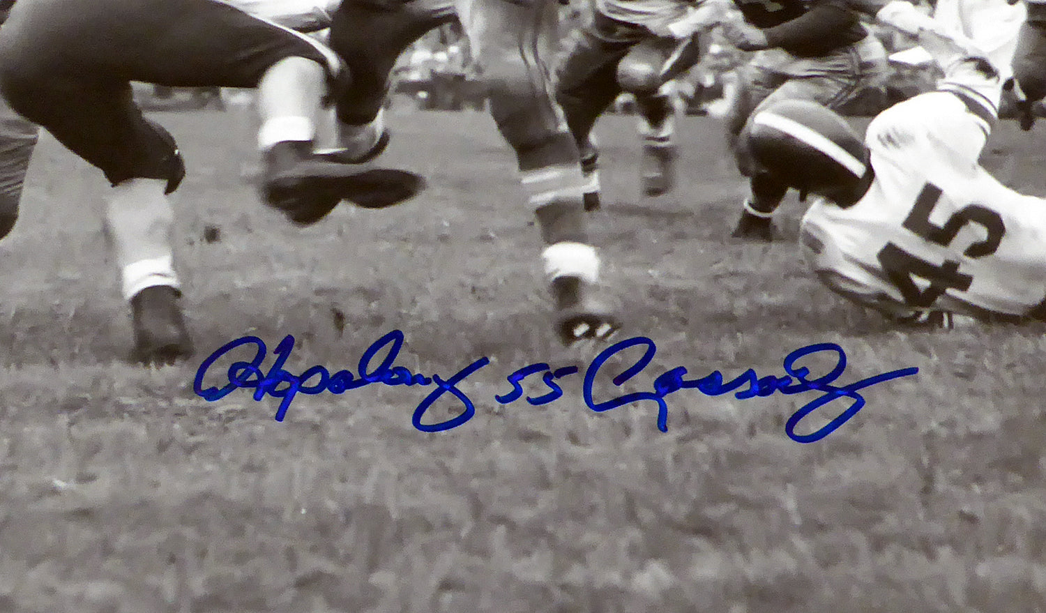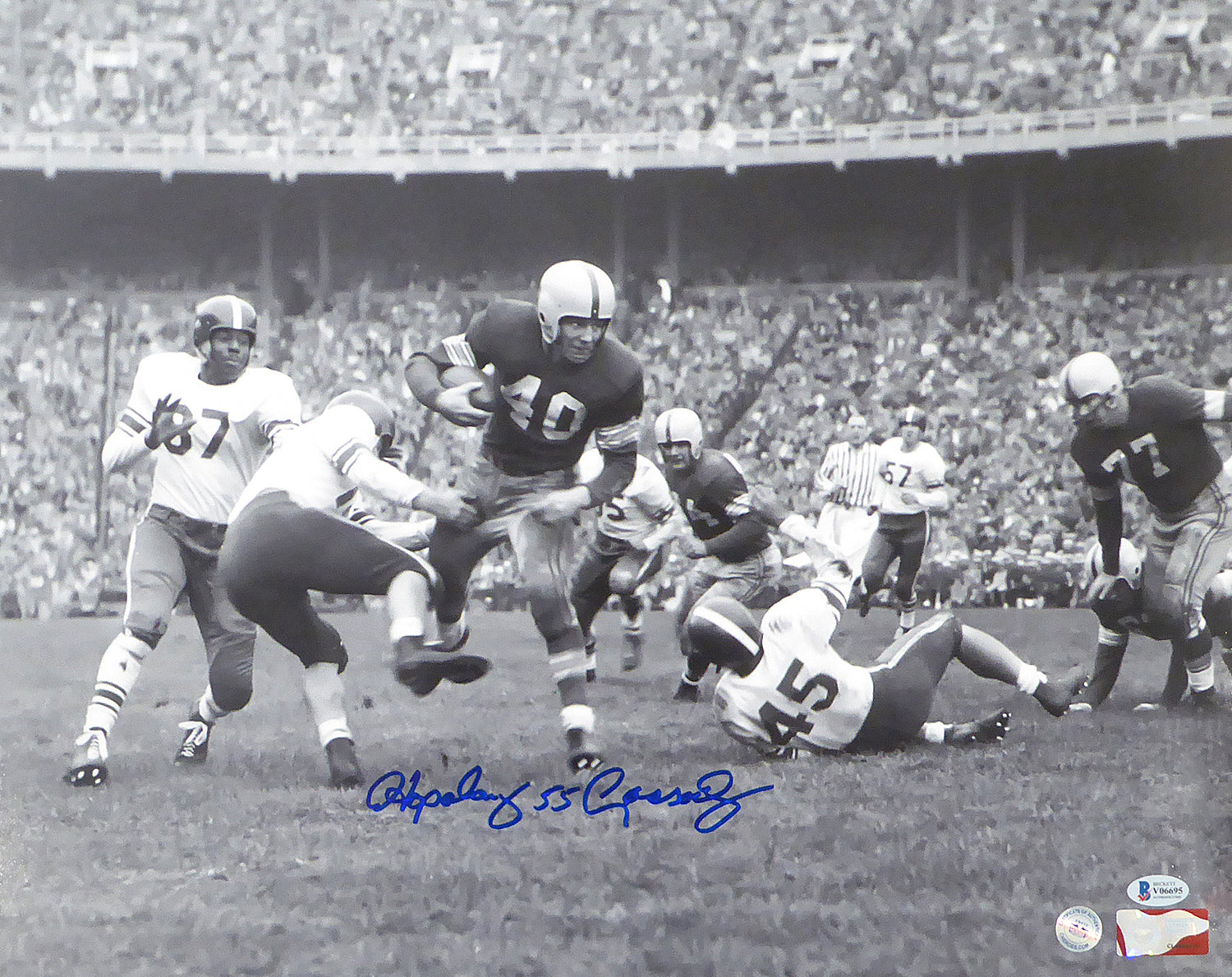 This 16x20 photo has been hand-signed by Hopalong Cassady, a legendary football player known for winning the 1955 Heisman Trophy as a standout halfback at Ohio State. This autographed collectible is a must-have for Buckeyes fans and sports memorabilia collectors alike.