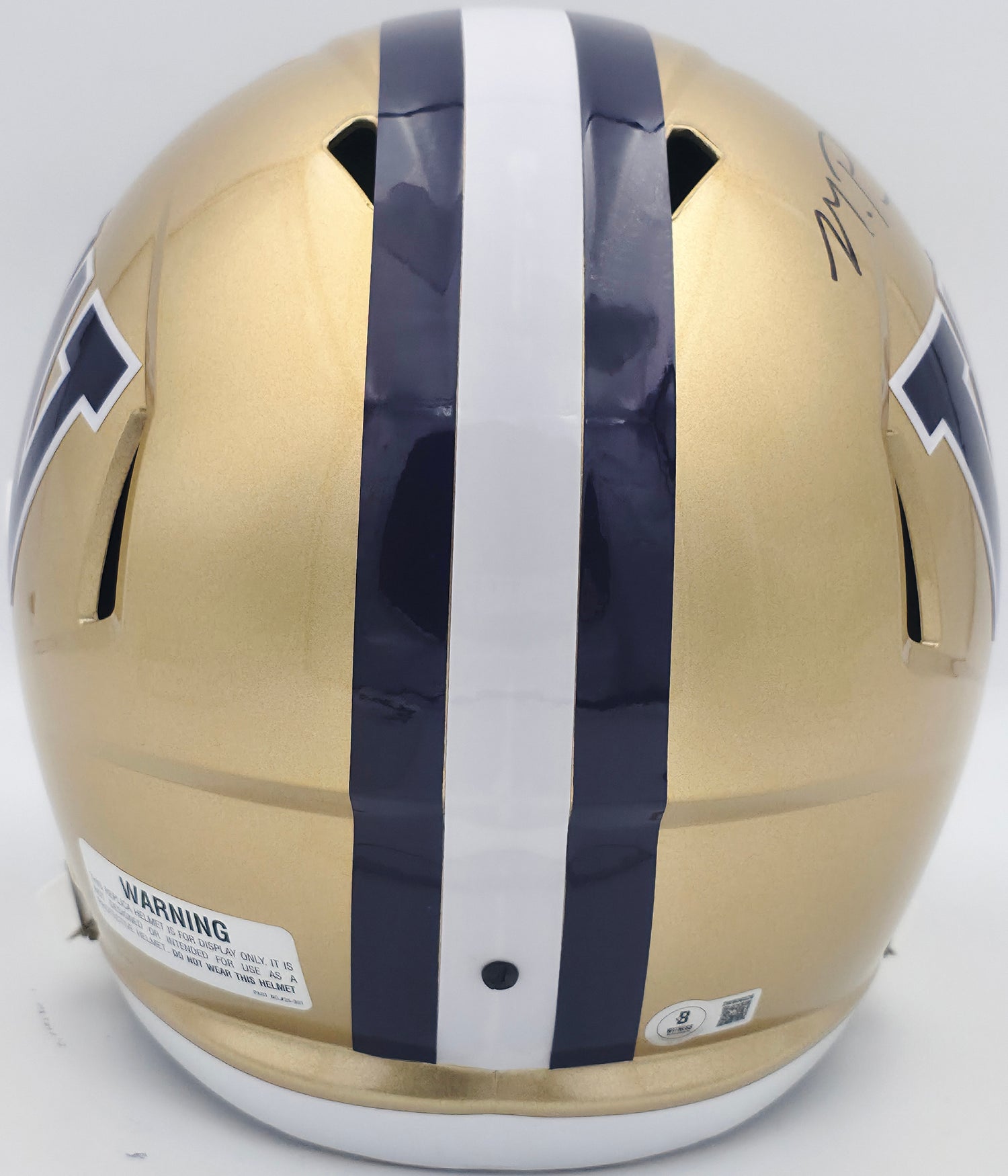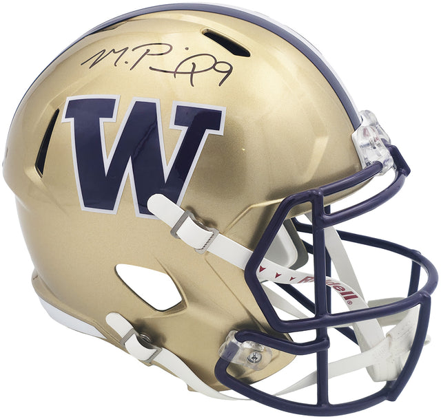 Celebrate a centerpiece season in college football with this officially signed Washington Huskies Gold Full Size Speed Replica Helmet autographed by star quarterback Michael Penix Jr.. A highlight of the 2023 NCAA season, Penix Jr. led the Huskies to an electrifying run toward national prominence, making this helmet a must-have for collectors and fans of Washington football history. This premium collectible has been hand-signed by Michael Penix Jr. and authenticated by Beckett Authentication Services (BAS), one of the most trusted names in memorabilia certification. Complete with a tamper-proof BAS witness hologram, this item is guaranteed to be 100% authentic. Whether you're a long-time Washington Huskies supporter, a dedicated Michael Penix Jr. fan, or a passionate college football memorabilia collector, this signed helmet is an iconic representation of a standout era.