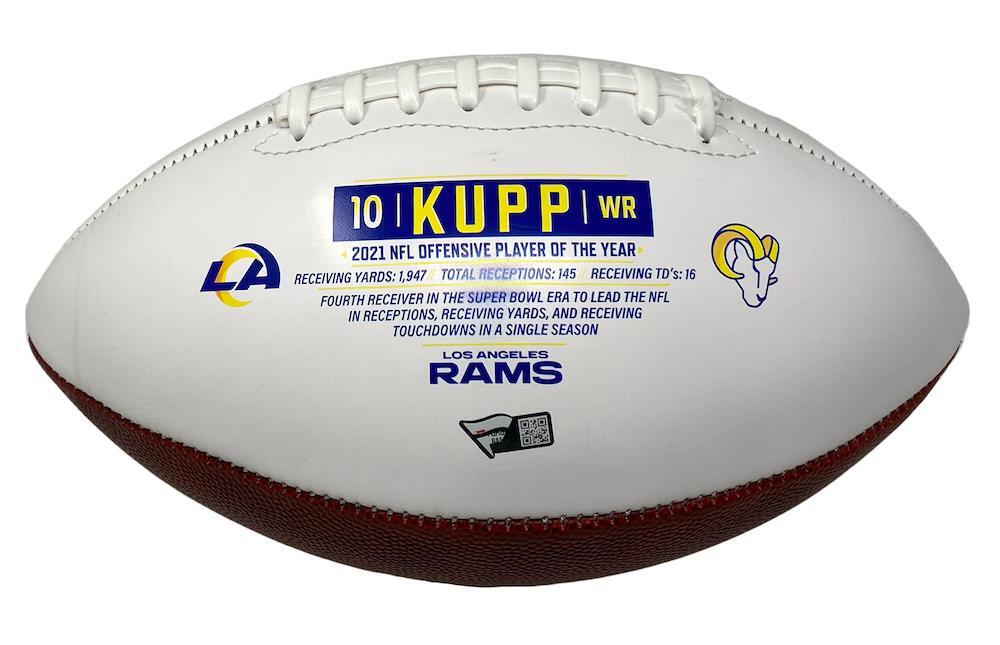 Own a piece of NFL history with this Cooper Kupp autographed Triple Crown commemorative white panel football, featuring the exclusive inscription "SB LVI MVP." This rare collectible celebrates Kupp's incredible Super Bowl LVI performance, where he led the Los Angeles Rams to victory and earned MVP honors.