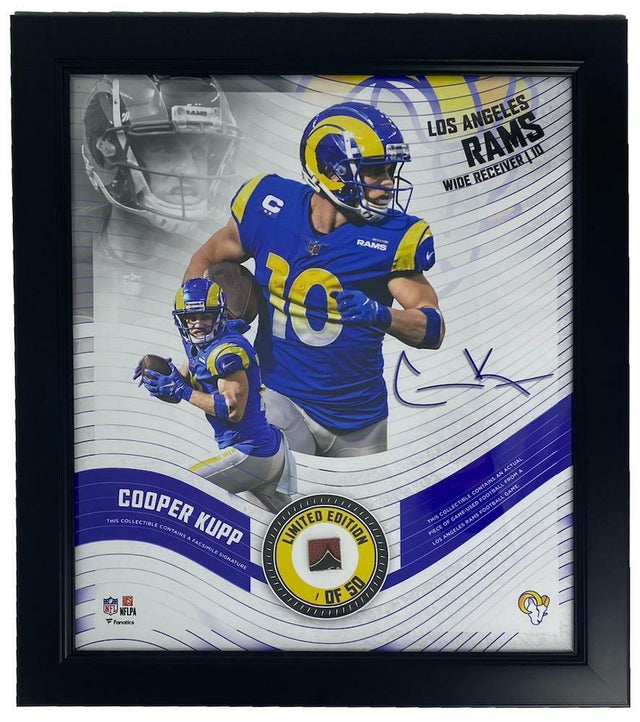 Own a piece of Los Angeles Rams history with this Cooper Kupp Framed 15" x 17" Game-Used Football Collage, a limited edition collectible—only 1 of 50 ever made. This stunning display is the perfect addition to any Rams fan's memorabilia collection, celebrating the incredible talent of Super Bowl LVI MVP Cooper Kupp.