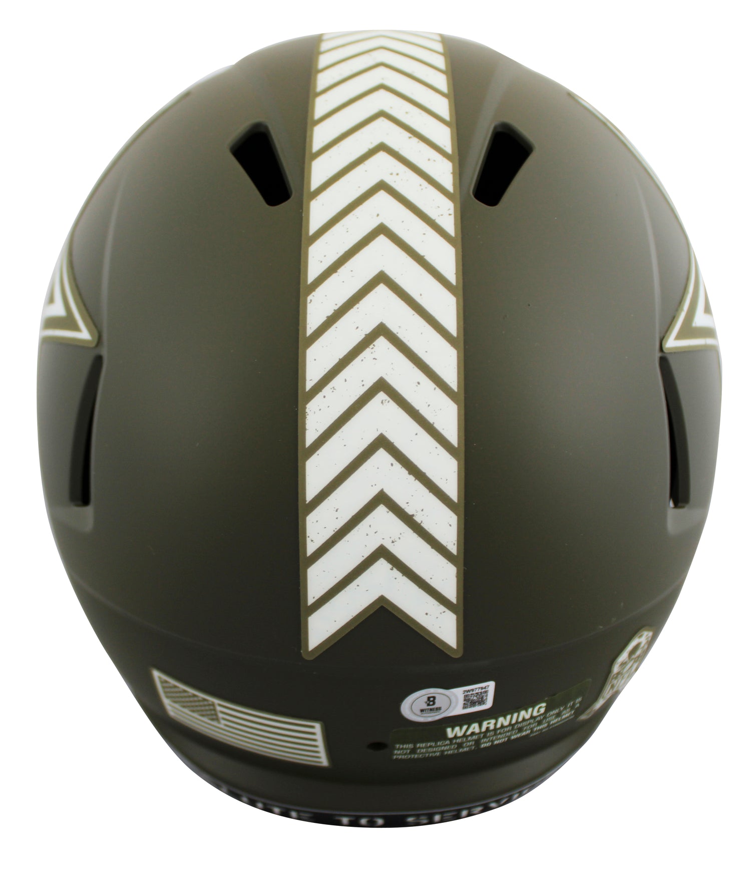 This Dak Prescott Autographed Alternate Salute To Service Riddell Full Size Speed Replica Helmet is a must-have for Dallas Cowboys fans and serious NFL memorabilia collectors. Personally signed by Dak Prescott, star quarterback of the Dallas Cowboys, this helmet celebrates the NFL's commitment to honoring our military through the “Salute To Service” initiative—making this piece both meaningful and collectible. Authenticated by Beckett Authentication Services (BAS), this item includes a tamper-evident hologram sticker with a scannable QR code for instant verification. It falls under the BAS Witnessed Protection Program, verifying that a Beckett representative was present during the signing to ensure 100% authenticity.