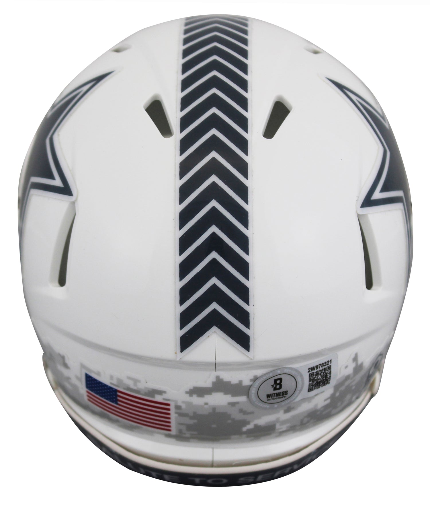 This Autographed Alternate 2024 Salute To Service III Speed Mini Helmet with a UV Mirrored Back Acrylic Display Case is a must-have for serious Dallas Cowboys fans and sports memorabilia collectors. Personally signed by Dak Prescott, the star quarterback of the Dallas Cowboys, this collectible celebrates both service and sportsmanship, making it a standout piece from the 2024 Salute To Service collection. Certified by Beckett Authentication Services (BAS), this mini helmet not only honors Dak Prescott’s gridiron excellence but also supports a greater American tradition of recognizing service members. Each helmet is accompanied by an affixed BAS hologram sticker with a scannable QR code—your immediate proof of authenticity. This item is part of the BAS Witnessed Protection Program, meaning a Beckett representative was present to authenticate the signature at the time of signing. While the image shown is representative, each piece is uniquely hand-signed, so signature placement and strength may slightly vary.
