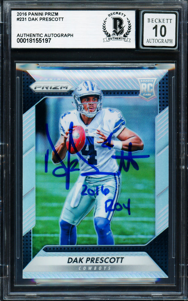This highly collectible 2016 Panini Prizm Dak Prescott Rookie Card #231 is a must-have for Dallas Cowboys fans and serious sports memorabilia collectors. Hand signed by Dak Prescott himself, this card is a powerful tribute to the quarterback's breakout rookie season when he was named the 2016 NFL Offensive Rookie of the Year. Encapsulated and authenticated by Beckett Authentication Services (BAS), this card not only features Prescott’s signature but also the special inscription "2016 ROY", making it a rare and valuable addition to any collection.