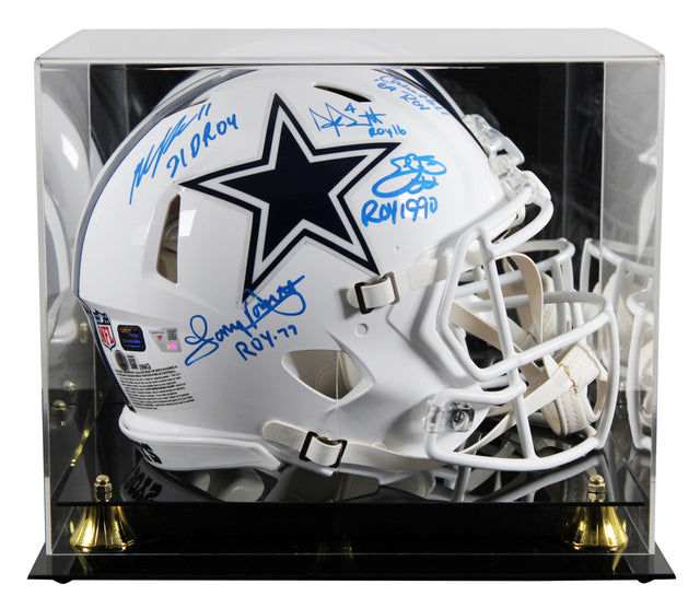 Celebrate the legacy of the Dallas Cowboys with this rare and highly collectible Autographed 2022 On-Field Alternate Riddell Full Size Speed Proline Helmet, featuring stunning signatures from five legendary Cowboys stars. Encased in a UV mirrored back acrylic display, this showstopping piece is a must-have centerpiece for any true Cowboys fan or NFL memorabilia collector. What makes this helmet truly special is the exclusive "ROY" inscription, paying tribute to multiple NFL Rookie of the Year award winners who helped shape the team's dynastic history.