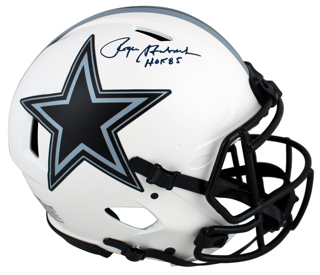 Own a piece of football history with this Autographed Alternate Lunar Riddell Authentic Full-Size Speed Proline Helmet, personally signed by Dallas Cowboys legend Roger Staubach. This exclusive collectible features the rare "HOF 85" inscription, celebrating Staubach's induction into the Pro Football Hall of Fame in 1985. Authenticated by Beckett Authentication Services (BAS), this item includes their new hologram with a scannable QR code for verification.