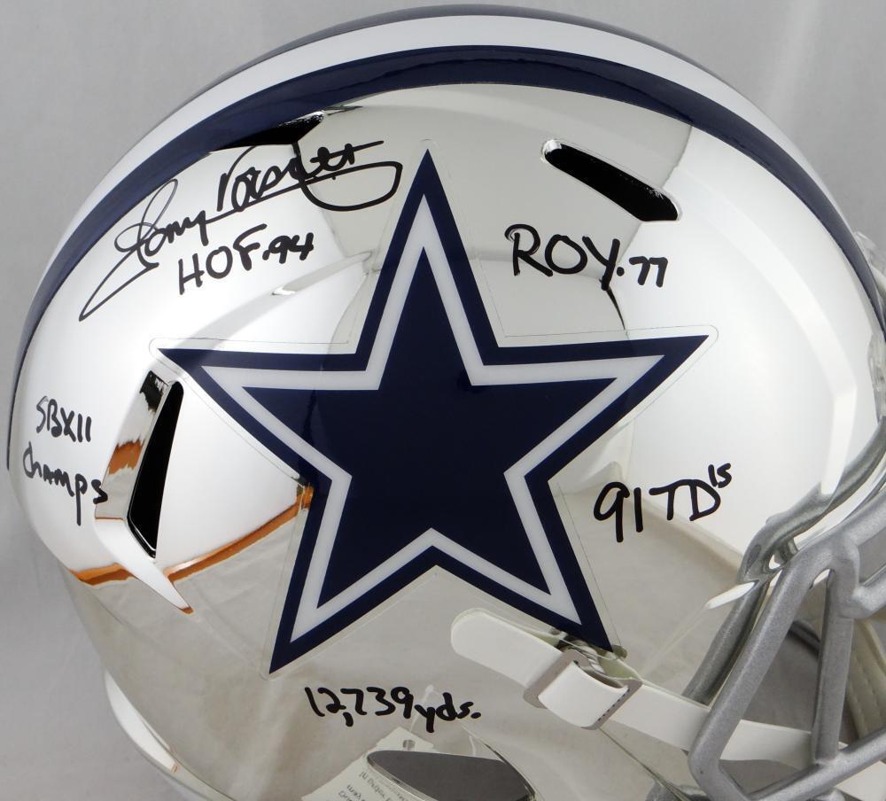 Own a piece of Dallas Cowboys history with this Tony Dorsett Autographed Full-Size Chrome Helmet, a must-have collectible for any devoted Cowboys fan or memorabilia enthusiast. This limited-edition Riddell Full-Size Chrome Replica Helmet is personally signed by Tony Dorsett, one of the greatest running backs in NFL history, and comes with five special inscriptions commemorating his legendary career: