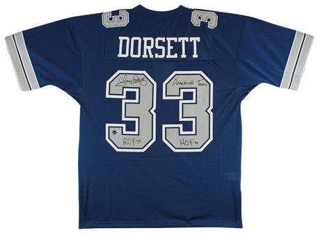 Cowboys Tony Dorsett "3x Insc" Signed Navy Blue M&N Jersey w/ Grey #s BAS Wit