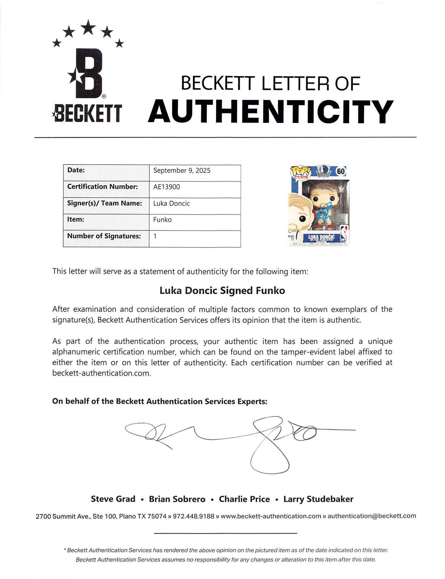 Mavericks Luka Doncic Authentic Signed #60 Funko Pop Vinyl Figure BAS #AE13900 is backordered and will ship as soon as it is back in stock.