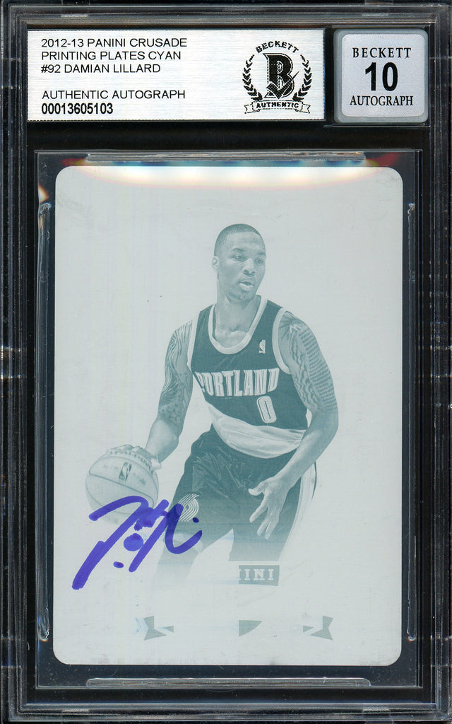 Own a rare piece of NBA history with this 2012-13 Panini Crusade Printing Plate 1/1 Rookie Card #92, hand-signed by Damian Lillard. This one-of-a-kind collectible is a must-have for serious basketball card collectors and Portland Trail Blazers fans. Authenticated and graded for signature quality at a perfect Gem Mint 10 by Beckett BAS, this card is securely encapsulated in a Beckett Authentication Services (BAS) tamper-proof holder for long-term preservation.