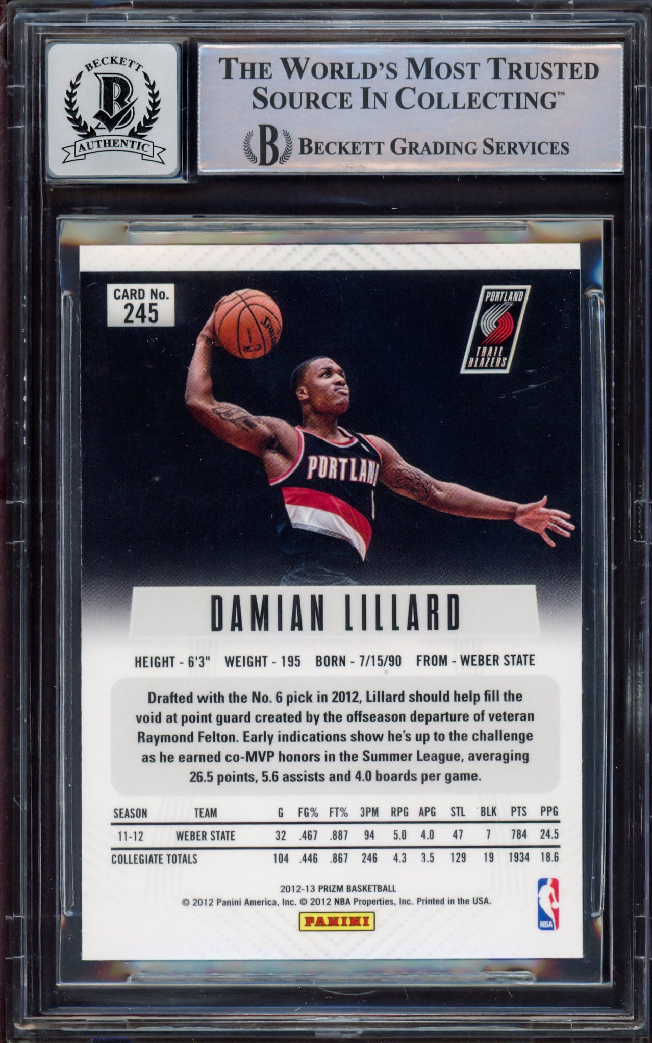 Damian Lillard Autographed 2012-13 Panini Prizm Rookie Card #245 Portland Trail Blazers Auto Grade Gem Mint 10 Beckett BAS #15531089