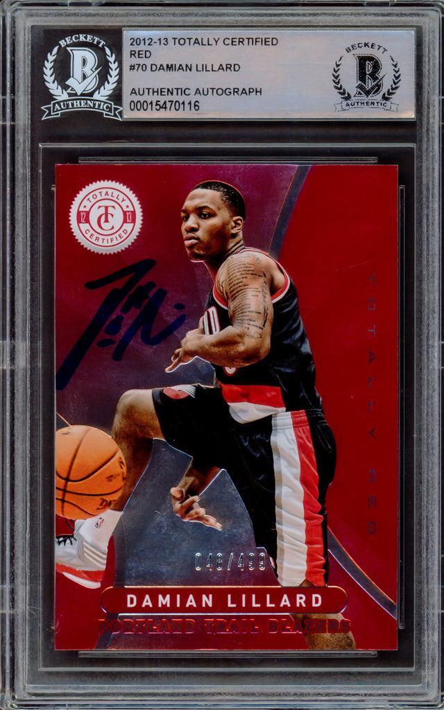 Own a piece of NBA history with this 2012-13 Panini Totally Certified Red Rookie Card #70, personally hand-signed by Damian Lillard. This rare collectible is a limited edition, serial-numbered #48/499, making it a must-have for serious collectors and Portland Trail Blazers fans. Authenticated by Beckett Authentication Services (BAS), this card comes securely encapsulated in a tamper-proof holder, ensuring its value is preserved for years to come.