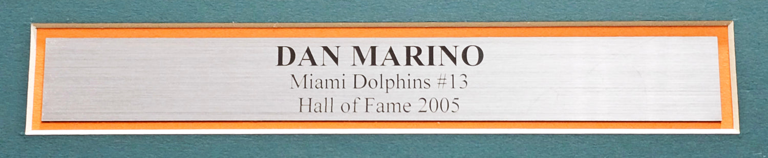 Own a piece of football history with this framed teal jersey autographed by legendary quarterback Dan Marino. Measuring approximately 31x36 inches with the frame, this striking display piece is perfect for any Miami Dolphins fan or serious sports memorabilia collector.