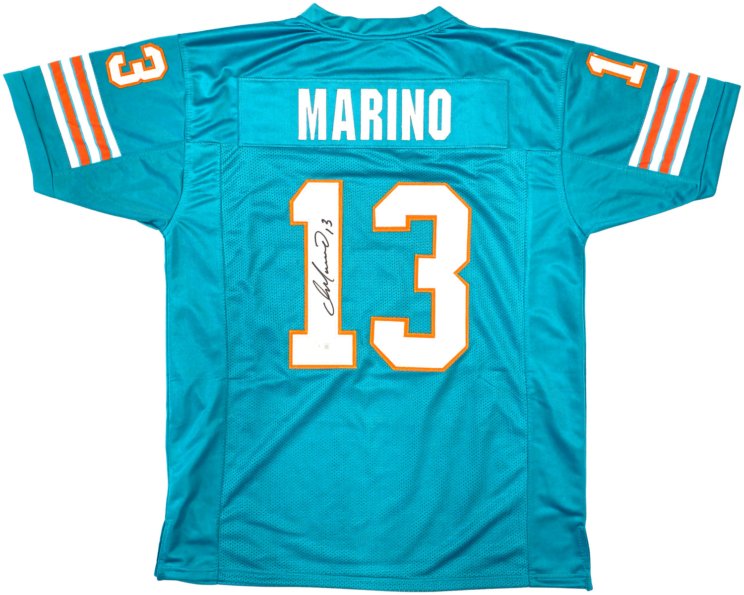 Own a piece of football history with this Dan Marino Hand-Signed Teal Custom Jersey—a must-have for dedicated Miami Dolphins fans and sports memorabilia collectors! This jersey is custom-made (not affiliated with any brand) and approximately XL in size, featuring sewn-in name and numbers for an authentic look and feel.