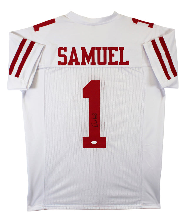 Own a standout piece of San Francisco 49ers history with this Autographed White Pro Style Jersey signed by Deebo Samuel. A rising NFL star known for his dynamic playmaking ability, Deebo Samuel has become a key figure in the 49ers offense and a fan favorite across the league. This exclusive collector’s item has been personally signed by Deebo Samuel and comes with a Certificate of Authenticity (COA) and tamper-evident hologram from JSA, ensuring 100% verified authenticity. Whether you're a die-hard Niners fan, a memorabilia investor, or a hobbyist collector, this jersey brings added value to any collection.