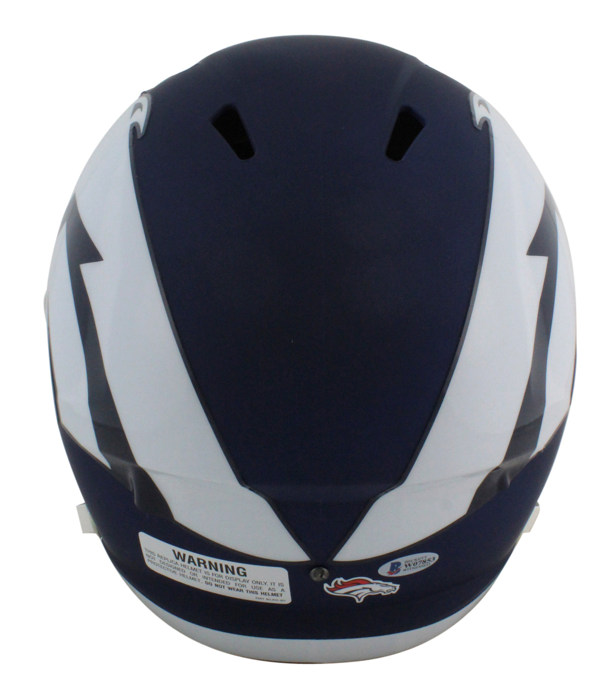 Own a piece of football history with this Autographed Alternate Amp Riddell Full-Size Speed Replica Helmet, personally signed by John Elway of the Denver Broncos. This exclusive collectible is a must-have for any dedicated Broncos fan or serious sports memorabilia collector.