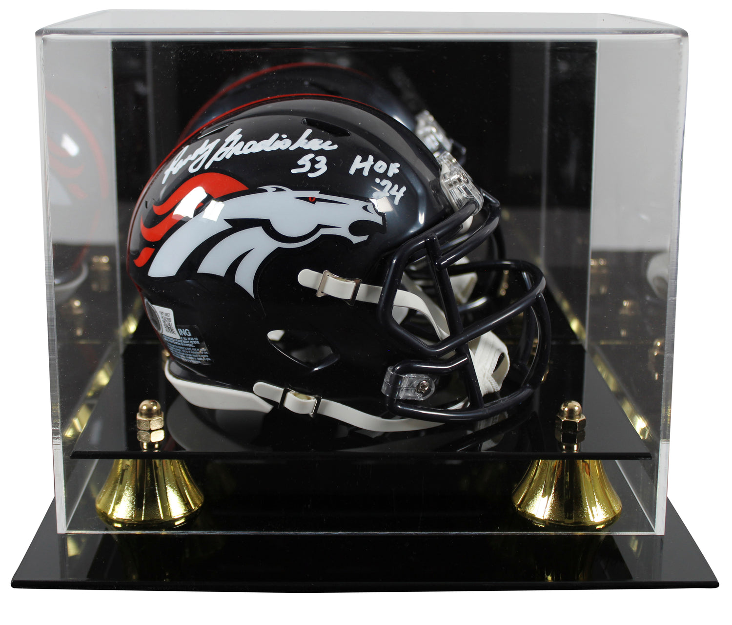 Own a piece of Denver Broncos history with this Autographed Speed Mini Helmet personally signed by Randy Gradishar, a legendary linebacker and Pro Football Hall of Fame Class of 2024 inductee. This exclusive collectible also includes the "HOF 24" inscription, making it a must-have for devoted Broncos fans and memorabilia collectors. To enhance its display, this item comes with a UV Mirrored Back Acrylic Display Case, perfect for showcasing your prized possession while protecting it from damage.