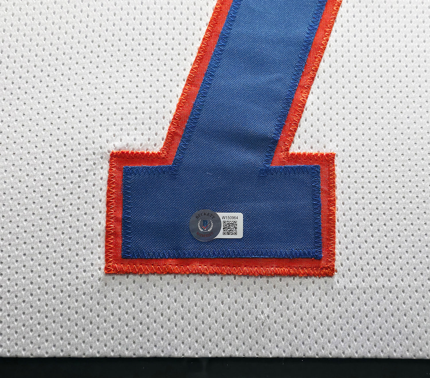 Celebrate the legacy of one of football’s greatest icons with this stunning framed White Jersey hand-signed by John Elway—a must-have for any serious sports memorabilia collector or Denver Broncos fan. This custom jersey commemorates Elway’s Hall of Fame career and impact on the NFL, including two Super Bowl championships and over 50,000 passing yards that helped define an era of football greatness. Expertly framed to a size of approximately 31x36 inches, this piece is perfect for display in your home, office, or fan cave. While this is a custom jersey (non-branded), it features professionally sewn-in name and numbers, providing a high-quality, authentic look that mirrors official team style. What truly sets this collectible apart is its certified authenticity. The autograph was witnessed and authenticated by Beckett Authentication Services (BAS)—one of the most trusted names in the industry—and comes with their tamper-proof witness hologram, giving you complete confidence in its legitimacy.