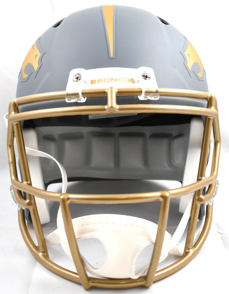 - Premium Riddell Full-Size Slate Speed Replica Helmet – A sleek, high-quality replica that showcases the Denver Broncos' iconic design.
