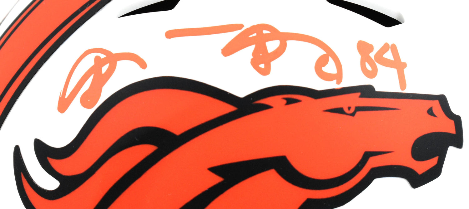 Celebrate one of the greatest tight ends in NFL history with this hand-signed Shannon Sharpe Denver Broncos Riddell Lunar Speed Mini Helmet—a must-have for any true football fan or memorabilia collector. As a Pro Football Hall of Famer and three-time Super Bowl Champion, Shannon Sharpe made an indelible mark on the game during his legendary career with the Denver Broncos. This collectible helmet is a tribute to that legacy, offering both visual appeal and historical significance to your collection.