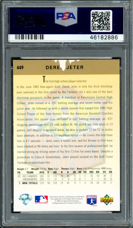 Very low stock (1 unit)$2,099Unit price /UnavailableDerek Jeter (New York Yankees) 1993 Upper Deck Baseball RC Rookie Card #449 - PSA 10 GEM MINT