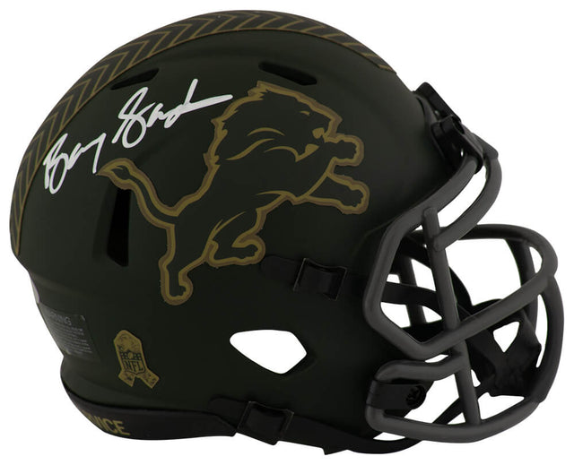 Celebrate an NFL legend with this Barry Sanders signed Detroit Lions 2025 Salute to Service Riddell speed mini helmet—a must-have for collectors and fans of one of football's all-time greats. Sanders, a Pro Football Hall of Famer and 10-time Pro Bowl running back, electrified stadiums as the face of the Detroit Lions in the 1990s. This 2025 edition mini helmet honors the military with its Salute to Service camo-inspired design, adding symbolic depth to an already iconic collectible.