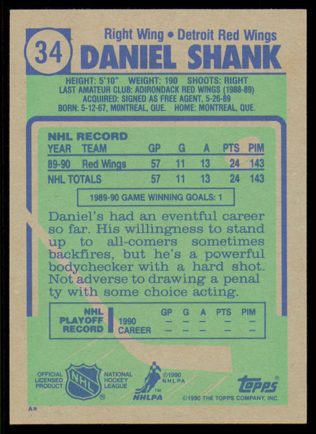 Daniel Shank Autographed 1990-91 Topps Rookie Card #34 Detroit Red Wings SKU #255153