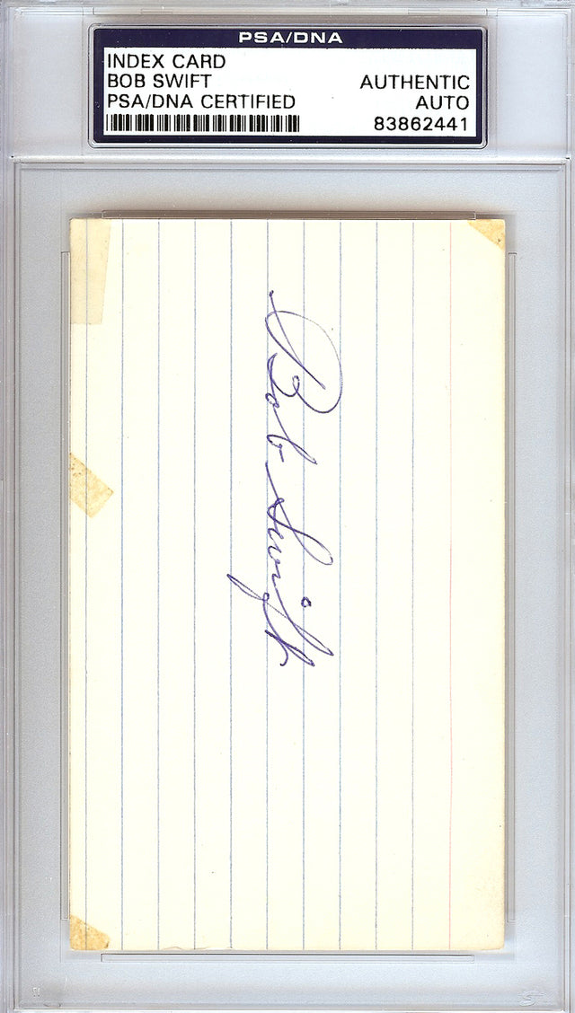 This 3x5 Index Card has been hand-signed by Bob Swift, making it a must-have for collectors and baseball history enthusiasts. A standout piece of memorabilia, this autograph is certified authentic by PSA/DNA and comes encapsulated in their tamper-proof holder for long-term preservation.
