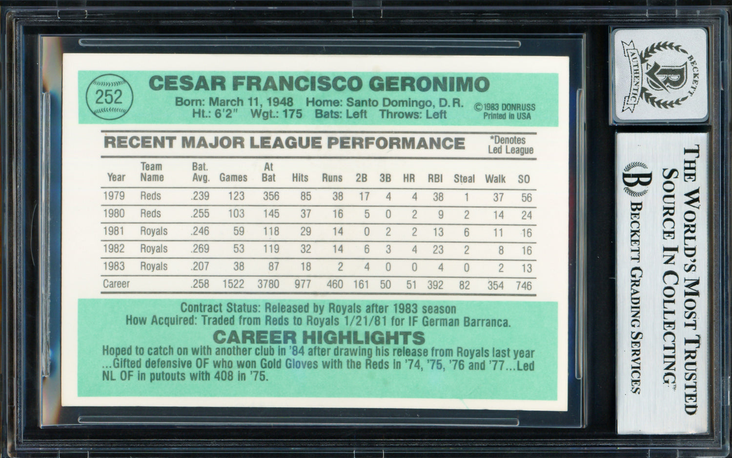 Cesar Geronimo Autographed 1984 Donruss Card #252 Kansas City Royals Auto Grade Gem Mint 10 Beckett BAS #18629879