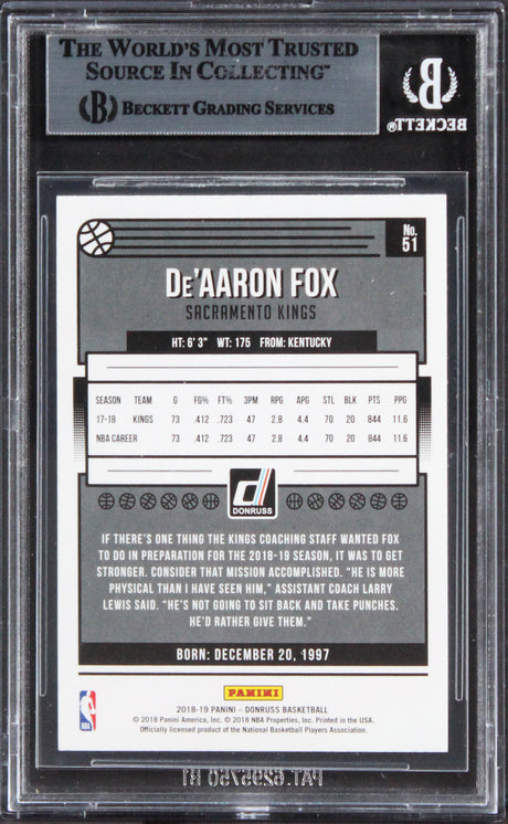Very low stock (1 unit)$359Unit price /UnavailableDe'Aaron Fox Signed 2018 Donruss Holo Green And Yellow Laser #51 Card BAS Slab