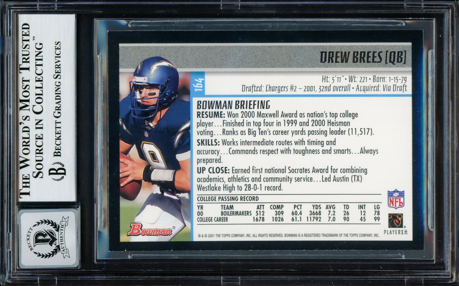 Drew Brees Autographed 2001 Bowman Rookie Card #164 San Diego Chargers Auto Grade Gem Mint 10 Beckett BAS Stock #220323