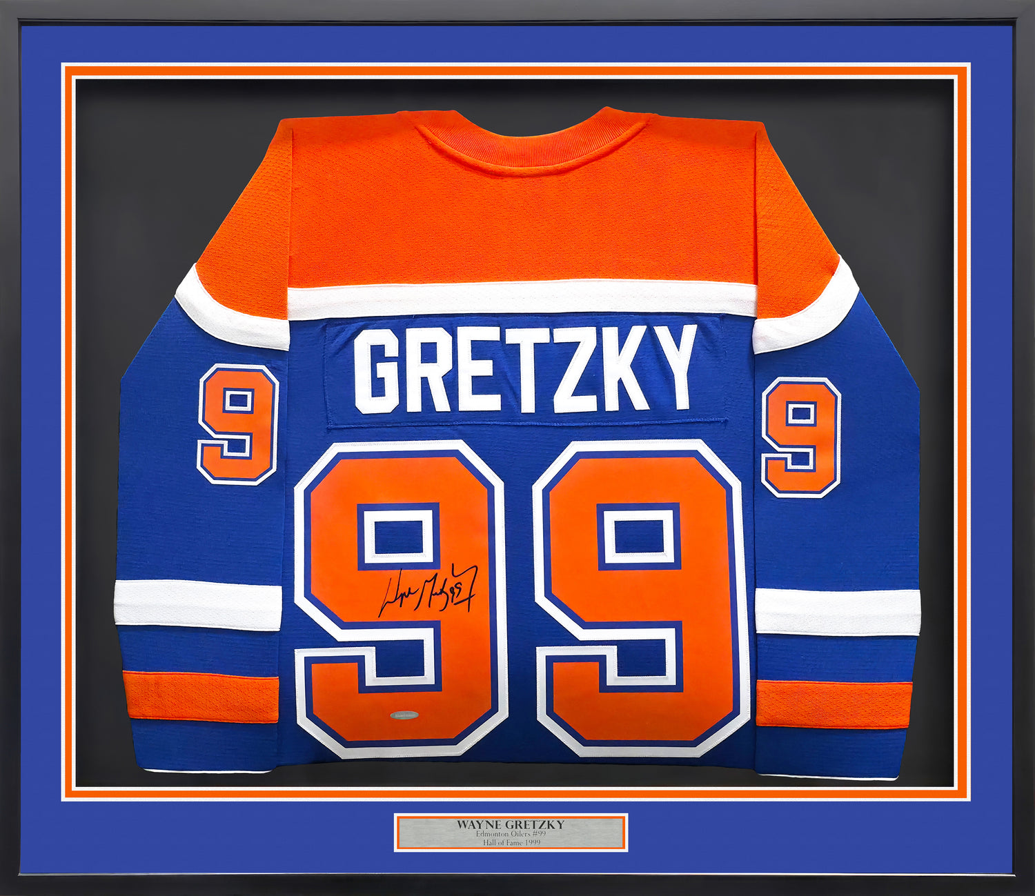 Celebrate hockey greatness with this stunning framed Blue Authentic Mitchell & Ness 1986 Vintage Throwback Edmonton Oilers Jersey, hand signed by the legendary Wayne Gretzky. Measuring approximately 31x36 inches with the frame, this collector’s piece pays tribute to the golden era of the Edmonton Oilers dynasty and one of the most iconic players in NHL history—known to fans around the world as "The Great One." This authentic 1986 throwback jersey captures the peak of Wayne Gretzky's career, a time when he led the Edmonton Oilers to dominate the NHL with unmatched skill, vision, and leadership. Gretzky's influence over the sport is legendary, and owning a piece of his legacy is a must-have for serious hockey fans and sports memorabilia collectors.