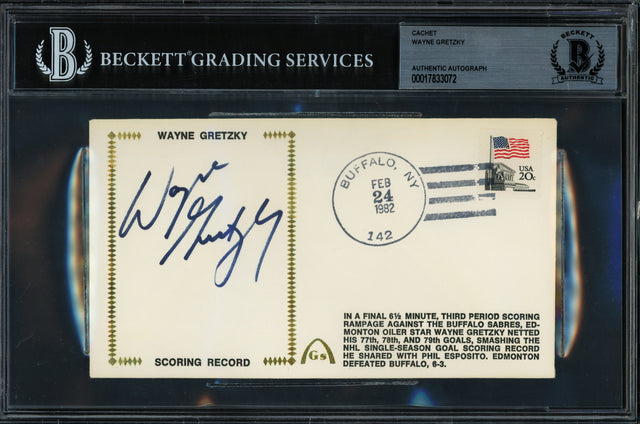 This exclusive collectible is a 1982 First Day Cover hand signed by Wayne Gretzky, the legendary "Great One" of the NHL. A truly rare and timeless piece, this cover is more than just a signature—it's a tribute to hockey history and Gretzky’s impact on the sport. Known for rewriting the record books, Wayne Gretzky dominated the NHL during the 1980s, and items from this early era of his career are highly sought-after by fans and collectors alike. Encapsulated by Beckett Authentication Services (BAS) in their tamper-proof holder, you can confidently display or preserve this valuable memorabilia as part of your personal collection or as a thoughtful gift for any hockey fan.