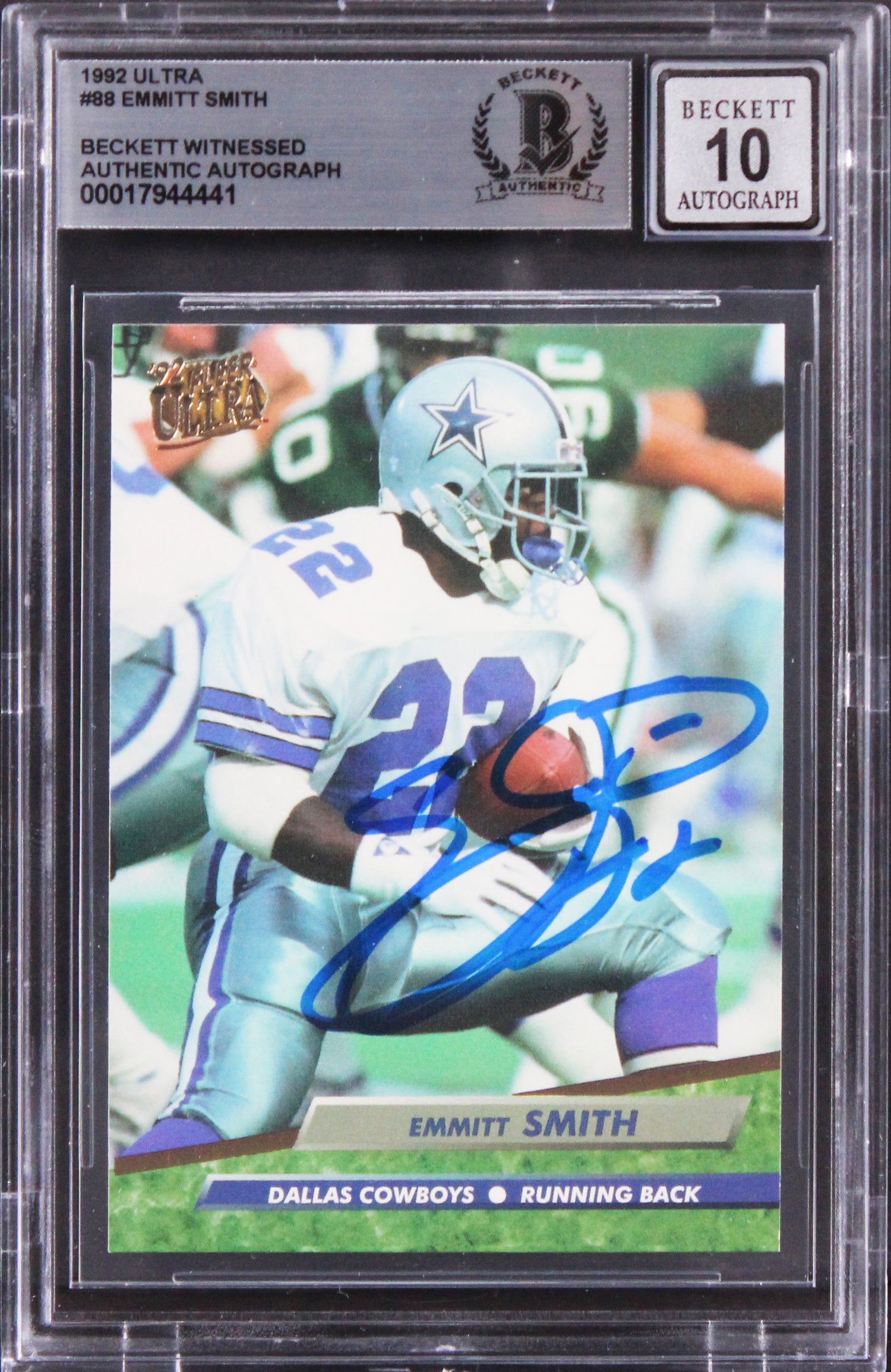 Celebrate the legacy of a true NFL legend with this Autographed Auto Graded Gem Mint 10! 1992 Ultra #88 Emmitt Smith Card, a must-have for any serious football memorabilia collector. Personally signed by Emmitt Smith of the Dallas Cowboys, the NFL’s all-time leading rusher, this card captures a pivotal era in football history. The 1992 Ultra series represents one of the most visually striking card designs of the early '90s, and when paired with a perfect Gem Mint 10 autograph grade, it becomes a standout piece in any collection. Authenticated and slabbed by Beckett Authentication Services (BAS), this item guarantees 100% authenticity and long-term preservation. While multiple cards were signed during our private signing session with Emmitt Smith, each autograph is unique in its placement and signature strength—making your piece truly one of a kind.