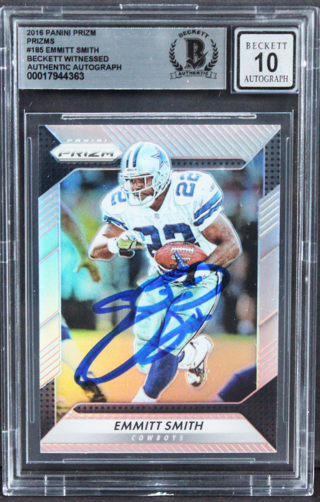 Celebrate one of the NFL’s all-time greats with this Autographed Auto Graded Gem Mint 10! 2016 Panini Prizm Prizms #185 Emmitt Smith Card. Legendary Dallas Cowboys running back Emmitt Smith, the league’s all-time leading rusher and three-time Super Bowl champion, personally signed this collectible, making it a must-have for any serious football memorabilia collector or Cowboys fan. Certified authentic and professionally slabbed by Beckett Authentication Services (BAS), this card offers exceptional value and long-term collectibility. Each signature is unique, as Emmitt personally autographed multiples during an exclusive signing, and while images are representative, your item will feature its own individual placement and pen strength.