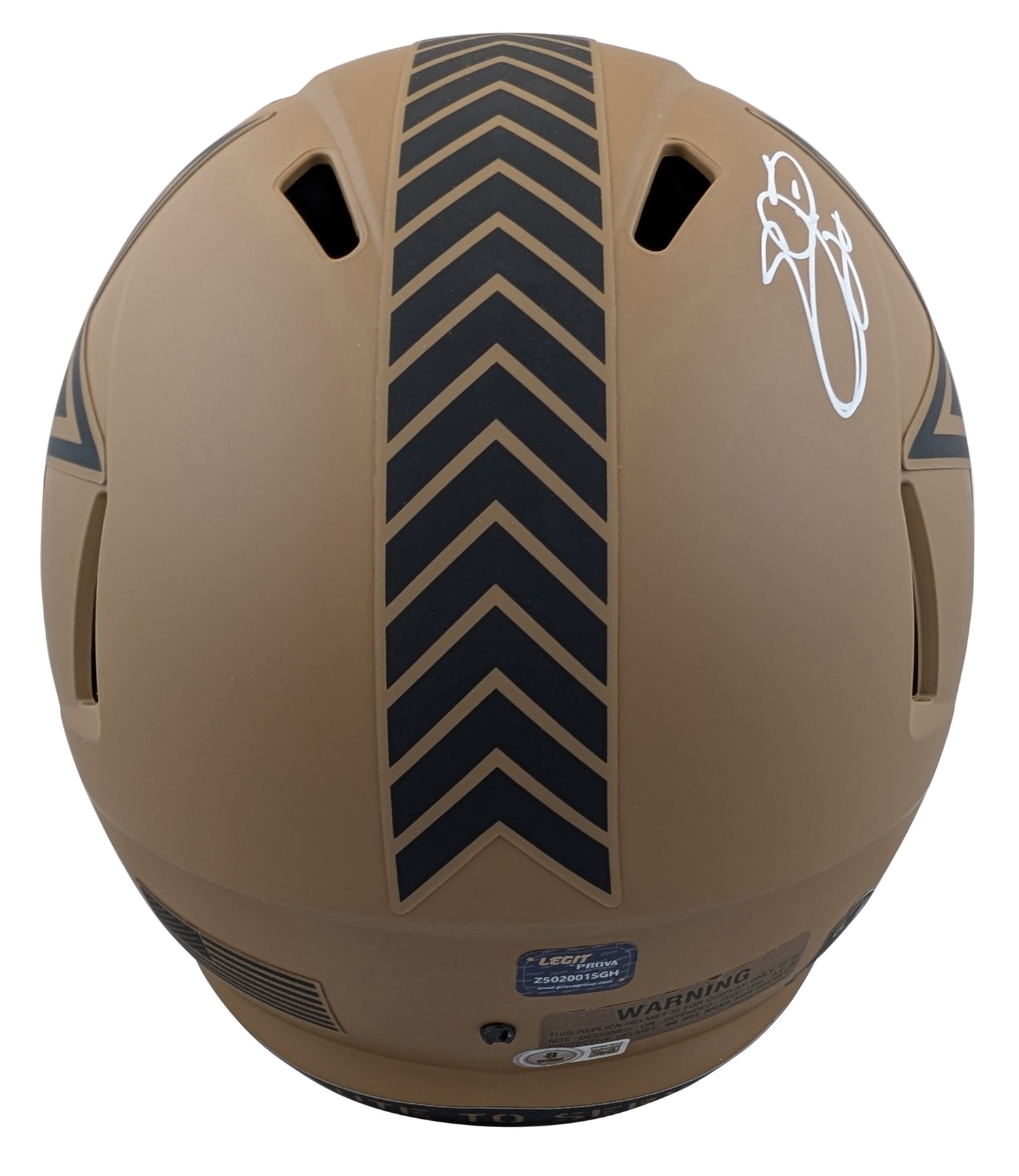 Celebrate unmatched gridiron greatness with this Autographed Alternate 2023 Salute To Service II Riddell Full Size Speed Rep Helmet, personally signed by legendary running back Emmitt Smith of the Dallas Cowboys. A tribute to both military service and sports excellence, this eye-catching piece includes a UV mirrored back acrylic display case, making it a true showstopper for collectors and fans alike. Emmitt Smith, the NFL’s all-time leading rusher and a three-time Super Bowl Champion, represents an iconic era of dominance for the Cowboys, and this helmet captures a significant piece of that legacy.