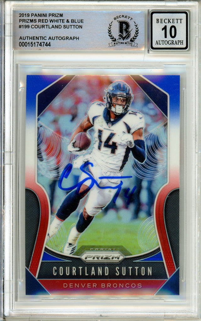 Elevate your collection with this 2019 Panini Prizm Red, White, Blue #199 Courtland Sutton Broncos BAS Autograph 10 sports trading card. A must-have for Denver Broncos fans and serious collectors, this card captures the talent of wide receiver Courtland Sutton, who has cemented himself as a key playmaker in the NFL.
