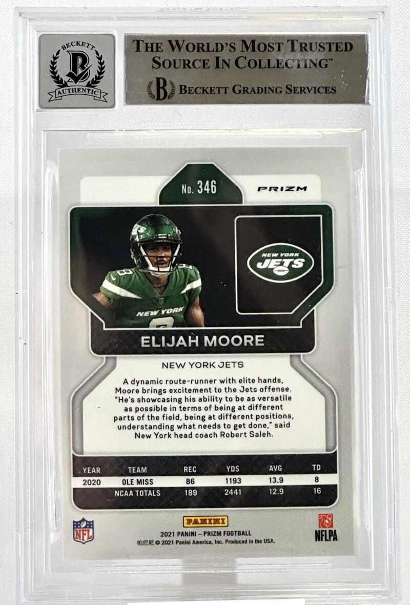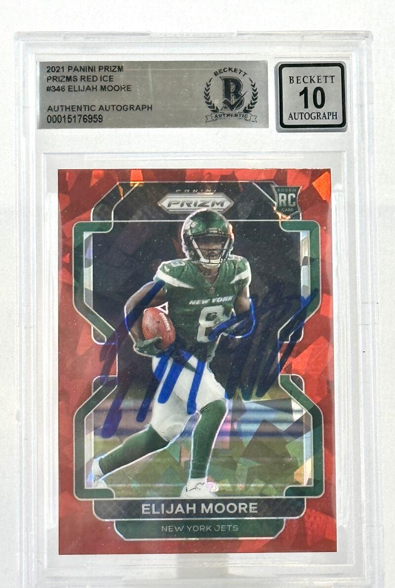 The 2021 Panini Prizm Prizms Red Ice #346 Elijah Moore Autograph is a must-have for collectors and New York Jets fans. This stunning card features a bold, on-card autograph from Elijah Moore and has been professionally authenticated by Beckett Authentication Services (BAS) with an Autograph Grade of 10, ensuring its quality and authenticity.