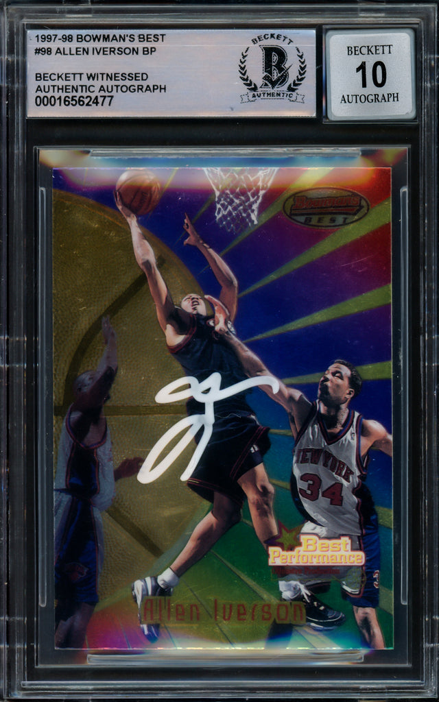 Allen Iverson Autographed 1997-98 Bowman's Best Card #98 Philadelphia 76ers Auto Grade Gem Mint 10 Beckett BAS Witnessed #16562477