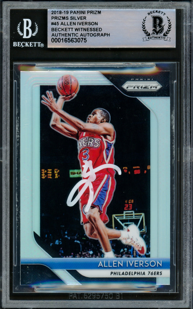 Allen Iverson Autographed 2018-19 Panini Prizm Prizms Silver Card #45 Philadelphia 76ers Beckett BAS Witnessed #16563075