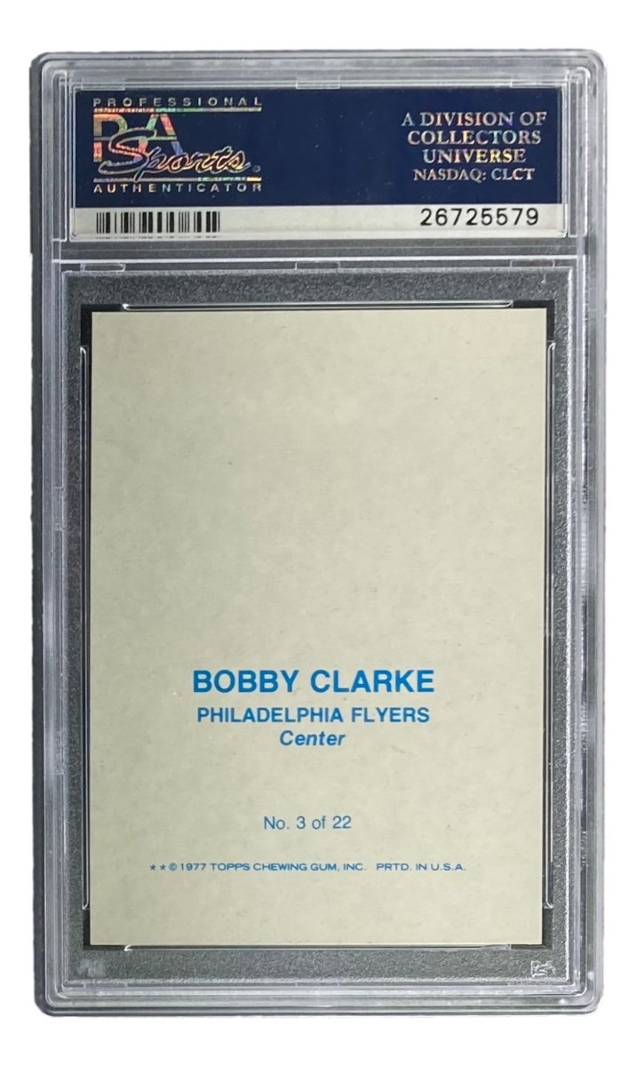 Bob Clarke Signed Flyers 1977 Topps Glossy #3 Trading Card Insert PSA/DNA Mint 9