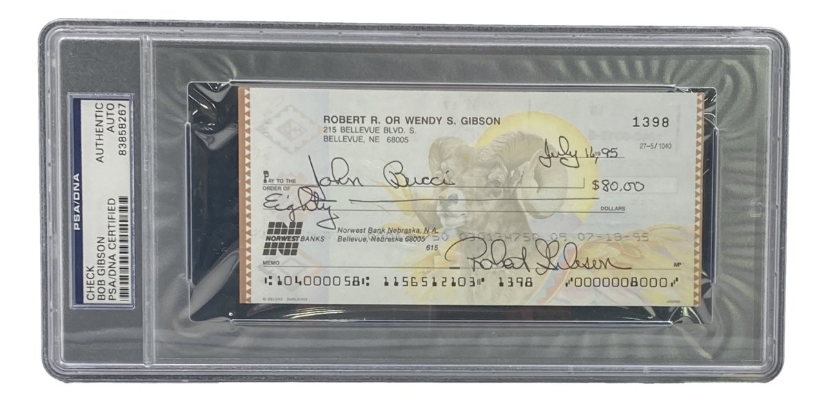 Own a remarkable piece of baseball history with this Bob Gibson St. Louis Cardinals signed bank check. As one of the most dominant pitchers in MLB history, Gibson’s legacy with the St. Louis Cardinals is legendary, making this signed check a prized collectible for fans and memorabilia enthusiasts alike. Authenticated and slabbed by PSA/DNA, this unique piece offers both historical value and investment potential.
