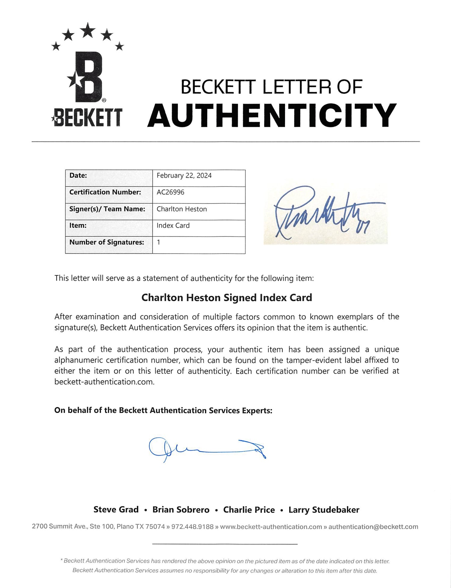 Charlton Heston Ben-Hur Authentic Signed 3x5 Index Card BAS LOA #AC26996