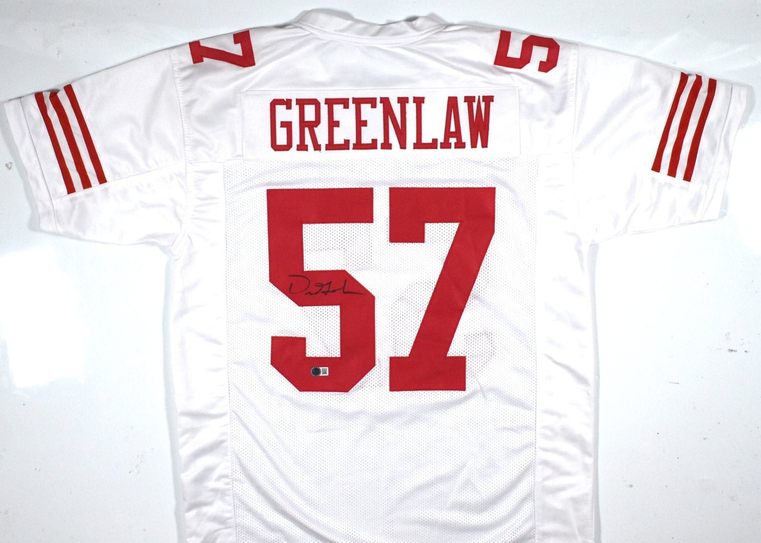 Dre Greenlaw Autographed White Pro Style Jersey - Beckett W Hologram *Black is backordered and will ship as soon as it is back in stock.