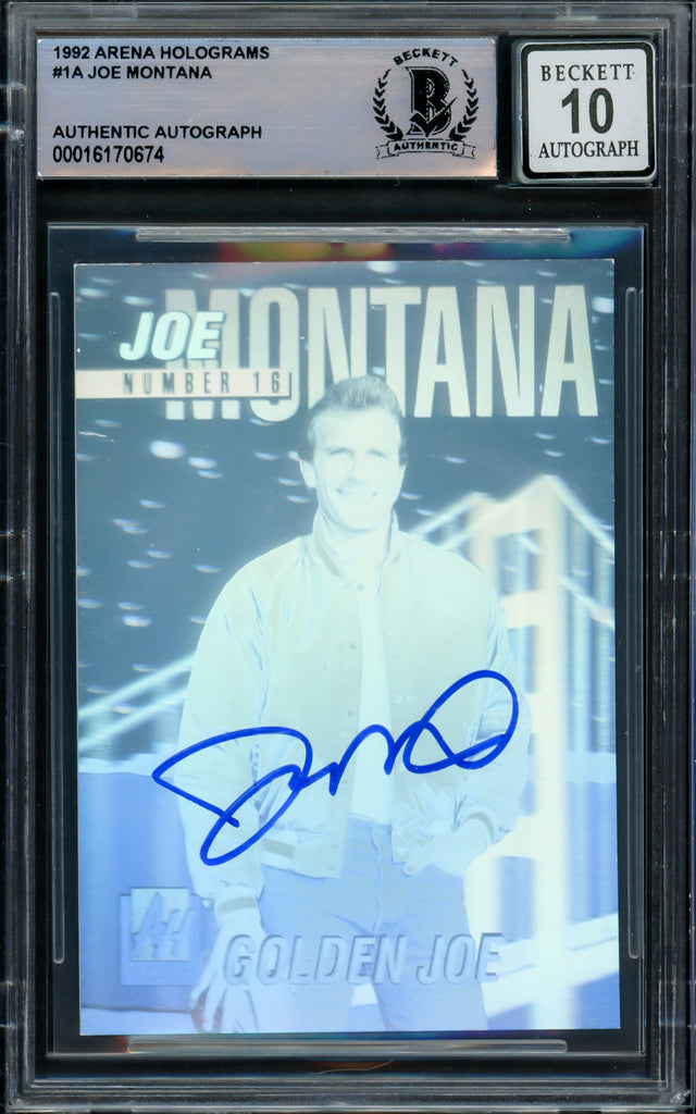 Joe Montana Autographed 1992 Arena Hologram Card #1A San Francisco 49ers Auto Grade Gem Mint 10 Beckett BAS #16170674
