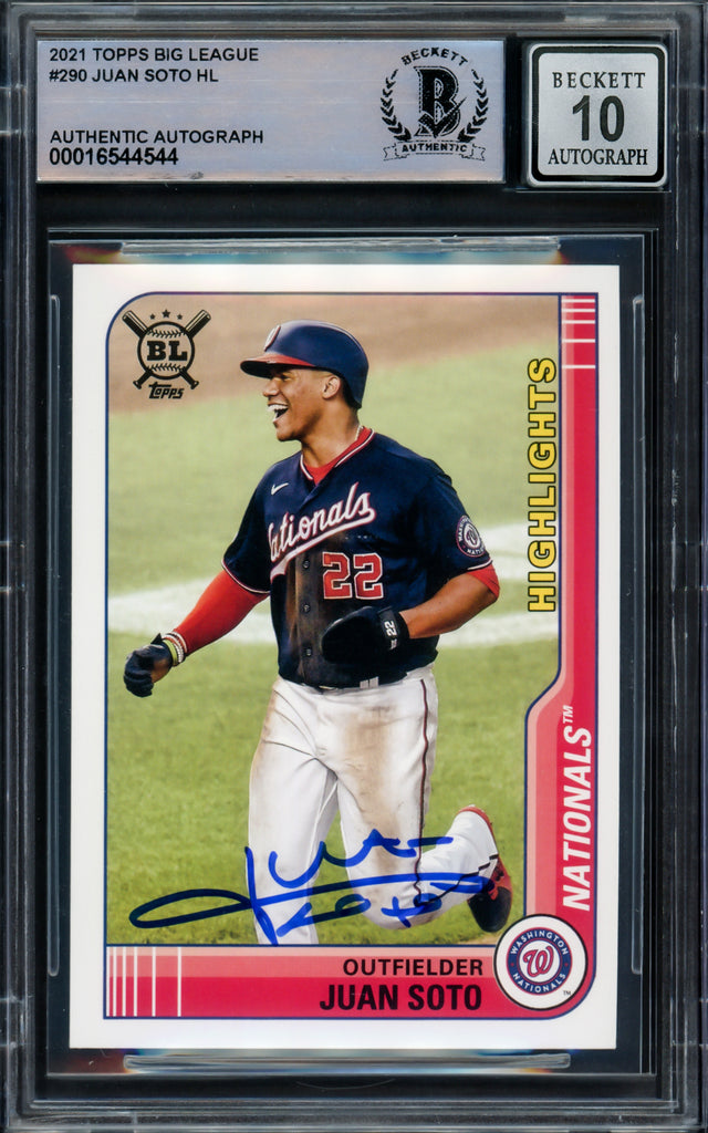 Own a piece of baseball history with this 2021 Topps Big League Card #290, hand-signed by MLB superstar Juan Soto. This collectible card is a must-have for fans and serious investors alike, featuring a Gem Mint 10 signature graded by Beckett Authentication Services (BAS) for unparalleled quality and authenticity.