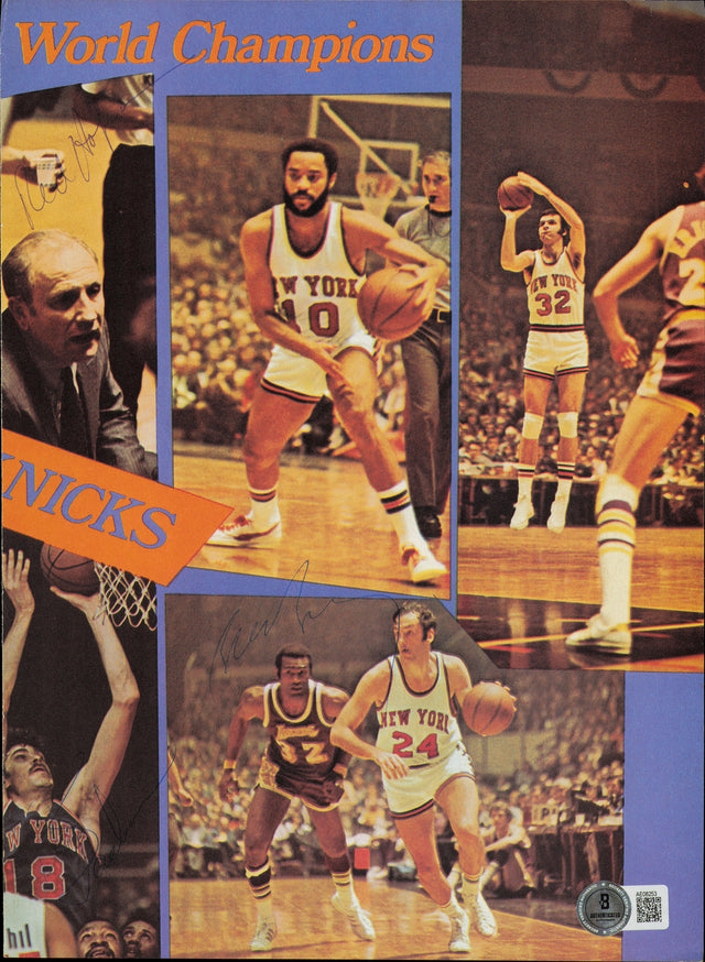 This 8x11 Magazine Page Photo is a must-have for basketball collectors and history enthusiasts. It has been hand-signed by legendary figures Phil Jackson, Bill Bradley, and Red Holzman, with an additional signature from Rick Barry on the back. A true piece of basketball history, this collectible represents some of the most influential names in the sport.