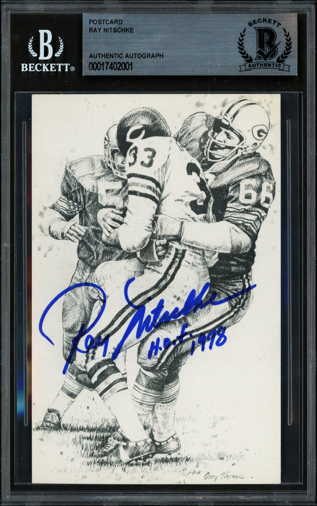 Add a piece of Green Bay Packers history to your collection with this hand-signed Ray Nitschke Postcard, featuring the Hall of Famer's signature and the personal inscription "HOF 1978." Ray Nitschke was a cornerstone of the iconic Packers dynasty under coach Vince Lombardi, making this a must-have for serious football fans and memorabilia enthusiasts. Authenticated and encapsulated by Beckett Authentication Services (BAS), this collectible ensures peace of mind with its tamper-proof holder. With Nitschke’s legendary status in NFL history, this is more than just a signed postcard—it's a certified tribute to a gridiron great.