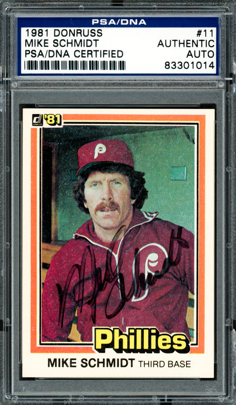 Very low stock (1 unit)$119Unit price /UnavailableMike Schmidt Autographed 1981 Donruss Card #11 Philadelphia Phillies PSA/DNA #83301014